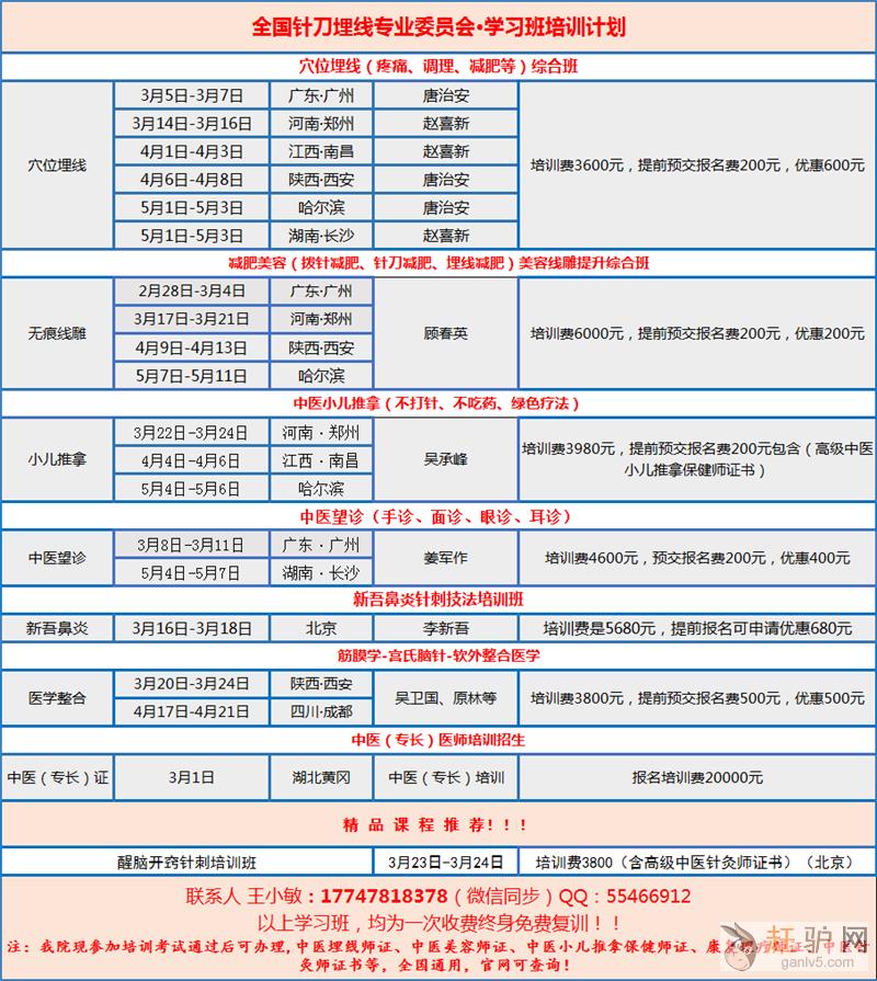 各级有关医疗机构及从业医师: 为了普及推广中医特效针法临床治疗技能,同时交流各地医学临床诊疗先进经验赶驴网www.ganlv5.com。由北京世纪仁康疼痛医学研究院联合北京七日康医学研究院共同主办的“全国第十二届医特色多种针法临床应用技术研修班”将定于2019年4月16日在河南省郑州市举办。届时将邀请全国知名专家授课,欢迎贵单位组织相关人员参加。 一、疗法介绍: (1.)“新九针”疗法 由于历史的原因,源于远古时代的“九针”疗法,逐渐后世医家放弃,导致“九针”中大多针具的流失。为了全面地继承和发展我国医学的宝贵遗产,山西省针灸研究所首任所长师怀堂教授,带领全所科研人员通过多年的努力,将两千年前就广为临床使用、种类丰富、治疗病种多样的“古九针”进行了深入细致地考证及研究,于1985年改制出最初的新九针针具,该针具包括了镵针、铍针、锋钩针、三棱针、火针、梅花针、磁圆梅针、鍉针、圆利针、毫针、长针。结合临床多年的丰富经验,反复探索,研制出了系列“新九针”针具,试用于临床,并取得了肯定的疗效,创制了独特的新九针疗法。由于改制后的新九针既保留了其原有的优点,又结合多种现代学说和技术,一经问世,就被国内外针灸界同仁赞誉为“新九针”,这一疗法也便成为“新九针疗法”。“新九针”是师怀堂医师经过50余年的中医针灸临床实践,在《内经》古九针的基础上大胆革新、潜心研制出的九种针具。它虽源于古九针,但在外形、针法及适应范围等都与古九针有较大的区别。 新九针临床应用的治疗范围: (1)鑱针:皮肤病,慢性胃病,面瘫。 (2)磁圆梅针:肩周炎,静脉曲张,小儿腹泻,胃肠功能紊乱,小儿遗尿症,动脉硬化,风湿性关节炎,中风后遗症,神经衰弱,不孕症g~a~n~l~v~5~c~o~m。 (3)鍉针:慢性咽炎(一次治愈),软组织挫伤,肛肠痔瘘。 (4)锋钩针:肩周炎,筋膜炎(一次性治愈),神经性头疼,腰背肌劳损,腱鞘炎,脑血栓后遗症,顽固性疼痛,胃痉挛,哮喘,急性结膜炎,急性扁桃体炎。 (5)火针:慢性胃肠炎,结肠炎,风湿类风湿关节炎,肩周炎,坐骨神经痛,三叉神经痛,中风后遗症,盆腔炎,痛经,顽固性失眠,网球肘,腰肌劳损,创伤性关节炎,甲状腺囊肿,阳痿,面瘫,末梢神经炎,扁平疣,皮肤结核,牛皮癣。 (6)圆利针治疗:癫痫,坐骨神经痛,三叉神经痛,肌肉关节剧痛,腰间盘突出,中风后遗症,肌无力,脑外伤后遗症。 (7)铍针治疗:皮肤良性瘤,体积较大疣,肛肠息肉。 (8)梅花针治疗:顽固性头痛,失眠,中风后遗症,神经性皮炎 (9)三棱针治疗:头痛,高热,急性咽炎,四肢麻木,小儿营养不良。 (10)多种针具联合应用治疗:顽固性失眠,神经性头痛,抑郁症,慢性鼻炎,三叉神经痛,面瘫,面肌痉挛,腰腿痛,足跟痛,甲状腺疾病,帕金森,耳聋,耳鸣,近视,斜视,视神经萎缩,无痛针灸减肥,美容(祛斑、去皱、美白)等。 (2.)埋线疗法 穴位埋药线疗法是根据针灸学理论、中药学和现代物理学相结合的产物,它通过针具和药线在穴位内产生的生物物理作用和生物化学变化,将其刺激信息和能量以及中药通过经络传入体内,而达到治疗疾病的目的。实际上埋线疗法是一种融多种疗法,多种效应于一体的复合性治疗方法。 穴位埋线疗法的适应范围非常广泛,目前主要用于各种慢性疾病,需要较长时间进行针灸治疗者www.ganlv5.com赶驴网。如支气管哮喘、过敏性鼻炎、慢性肠炎、胃炎、腰椎间盘突出、坐骨神经痛等等,也常常用于美容、减肥、保健等项目,将这种疗法用于治疗痤疮、黄褐斑、肥胖以及人体疲劳综合症等。适应工作压力比较大,生活节奏比较快的现代人。 (3.)浮针疗法 浮针疗法是用一次性使用浮针在非病痛区域的浅筋膜层(主要是皮下疏松结缔组织)进行扫散手法的针刺疗法,具有几无痛苦、无副作用、见效快、适应症广等特点。 新近研究表明:传统针刺方面起作用的正是浅筋膜中的主要组织:皮下疏松结缔组织。浮针疗法不像传统针刺一样深入多层组织,仅仅作用在浅筋膜,力专效宏。 本疗法主要治疗各种疾病(如头痛、网球肘、膝痛、踝关节扭伤、腕管、综合征、急性腰扭伤、带状疱疹后遗症、痛经、胆囊炎等)引起的疼,对酸、麻木、胀等症状也有较好的作用。 (4.)腹针疗法 腹针疗法是通过针刺腹部特定穴位治疗全身疾病的一种针刺方法。该疗法根据以神阙穴为中心的腹部先天经络系统理论,寻找与全身部位相关的反应点,并对其进行相应的轻微刺激,从而达到治疗疾病的目的。临床主要适用于神经系统和运动系统疾病。 主治落枕、肋间神经痛、肩部扭伤、急性腰扭伤、坐骨神经痛等病症Dgx。 用腹针疗法。分别取相对应的颈部、胸部、肩部、腰部、下肢部穴。也可配合体针疗法。 二、主讲内容: 第一天 1、新九针总论、治疗范围、适应症、禁忌症 2、埋线疗法总论、诊疗范围、优势3、浮针总论、诊疗范围、适应症、禁忌症 4、腹针总论、诊疗范围、适应症、禁忌症 5、蝶腭神经节针刺临床应用 6、刀钩针的临床应用 第二天 1、督主周身疾病 2、疼痛3、针灸与疼痛 4、针灸处方 5、关节影像诊断学6、秩边透水道 7、寰枢关节半脱位8、醒脑开窍法 9、脑血管疾病10、抑郁症11、神经衰弱 12、美容、减肥 第三天 1、面瘫2、面肌痉挛3、头痛 4、眩晕5、老年性痴呆 6、帕金森综合征7、三叉神经痛 8、枕大神经痛9、耳聋耳鸣 10、牙痛 11、鼻炎12、痤疮13、