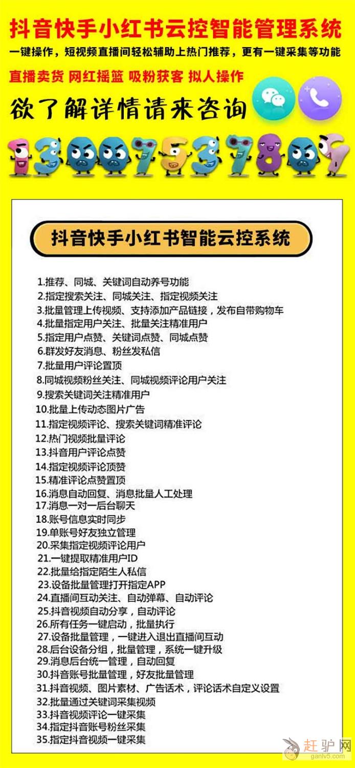 抖音快手云控系统是什么?说白了,它是一个可以批量自动控制操作抖音、快手账号的一个工具www.ganlv5.com赶驴网。 抖音快手小红书云控软件能做什么? 看下面 1. 批量上传视频,可对自己上传视频可点赞、评论也可对别人批量关注、点赞、转发、评论,养号等等赶_驴_网。 2 . 控制多个抖音账号全自动对主播评论、点赞、关注、私信等多项操作 3. 对主播的粉丝直接进行批量关注、私信,以及对自己的关注以及关注的对象进行私信haIl。 4.强制增加播放量欢迎www.ganlv5.com。 上面是主要的功能,其实和我们自己玩抖音一样,我们能玩的功能,抖音群控软件都可以去批量自动操作,提高了效率,当然光有个软件也不行,还需要一个服务器搭配来使用赶~驴~网。 抖音云控系统就是大家经常看到的,有个支架,上面摆满了一排排手机的这种,需要手机和电脑连接,因为线控需要购买真实手机来使用,所以,一般用这个成本比较高,但是走的长远,用的更久赶.驴.网。手机端不root,不adb调试,不越狱赶~驴~网。 上面的简单介绍,大家应该对抖音云控软件多多少少有点了解了,我公司也是主要做抖音云控系统,想了解更多的,可以联系我们赶驴网。
